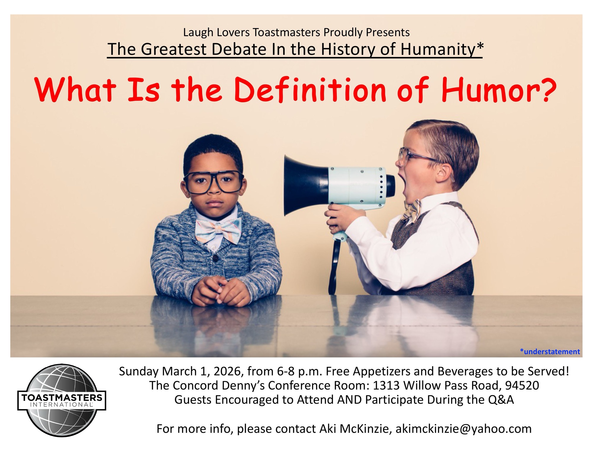 Laugh Lovers Toastmasters Proudly Presents The Greatest Debate In the History of Humanity* What Is the Definition of Humor? Come find out, Sunday March 1, 2026, from 6-8 p.m. Free…