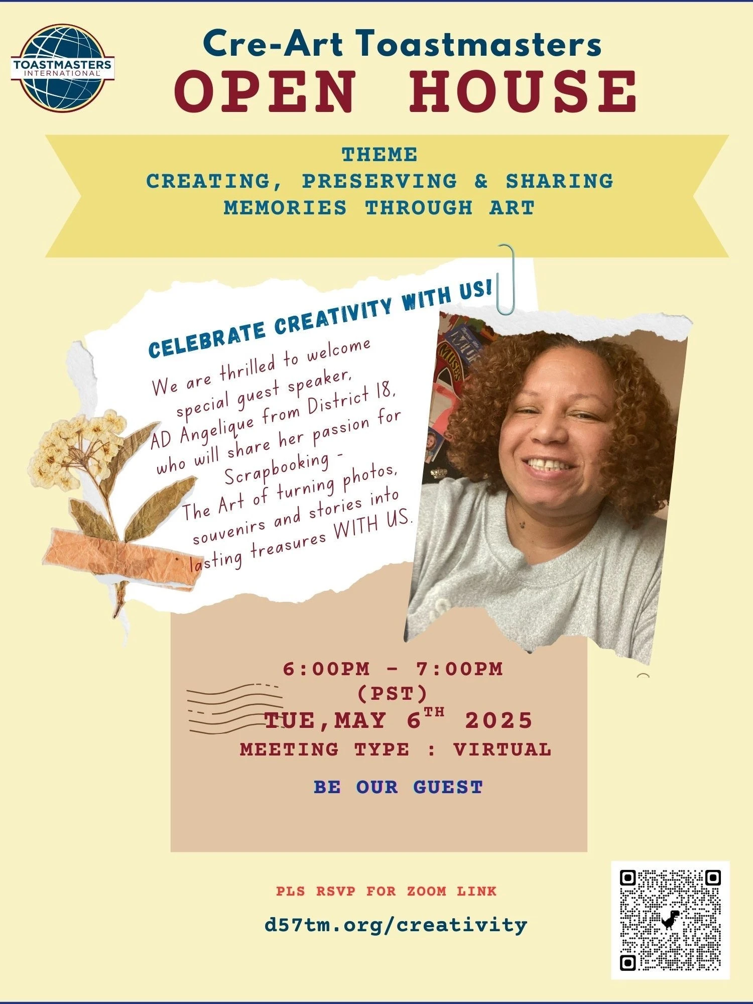 Cre-Art is a online Toastmasters group that is (FABYAEE) For Artists, By Artists, And Everyone Else! This Open House Theme is “Creating, Preserving, and Sharing Memories Through Art!