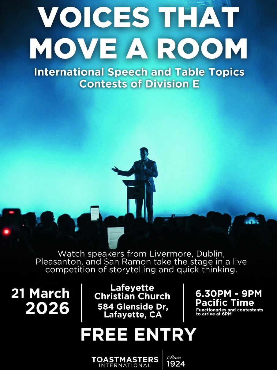 Speakers from across the Tri-Valley — Livermore, Dublin, Pleasanton, and San Ramon — will gather for a live speaking competition showcasing powerful storytelling and quick-thinking brilliance. Watch as contestants deliver prepared speeches in the International Speech Contest and rise to the challenge of the Table Topics Contest, where they must respond to a surprise question with no preparation.